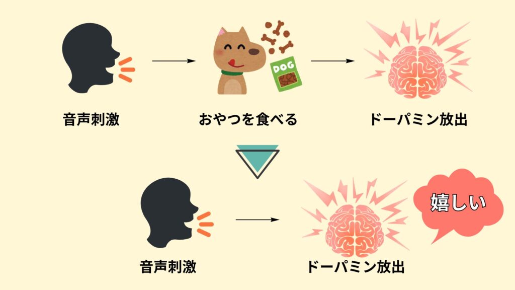 「褒め言葉→おやつ」が繰り返されることで、次第に褒め言葉を聞くだけでドーパミンが放出されるようになります。
